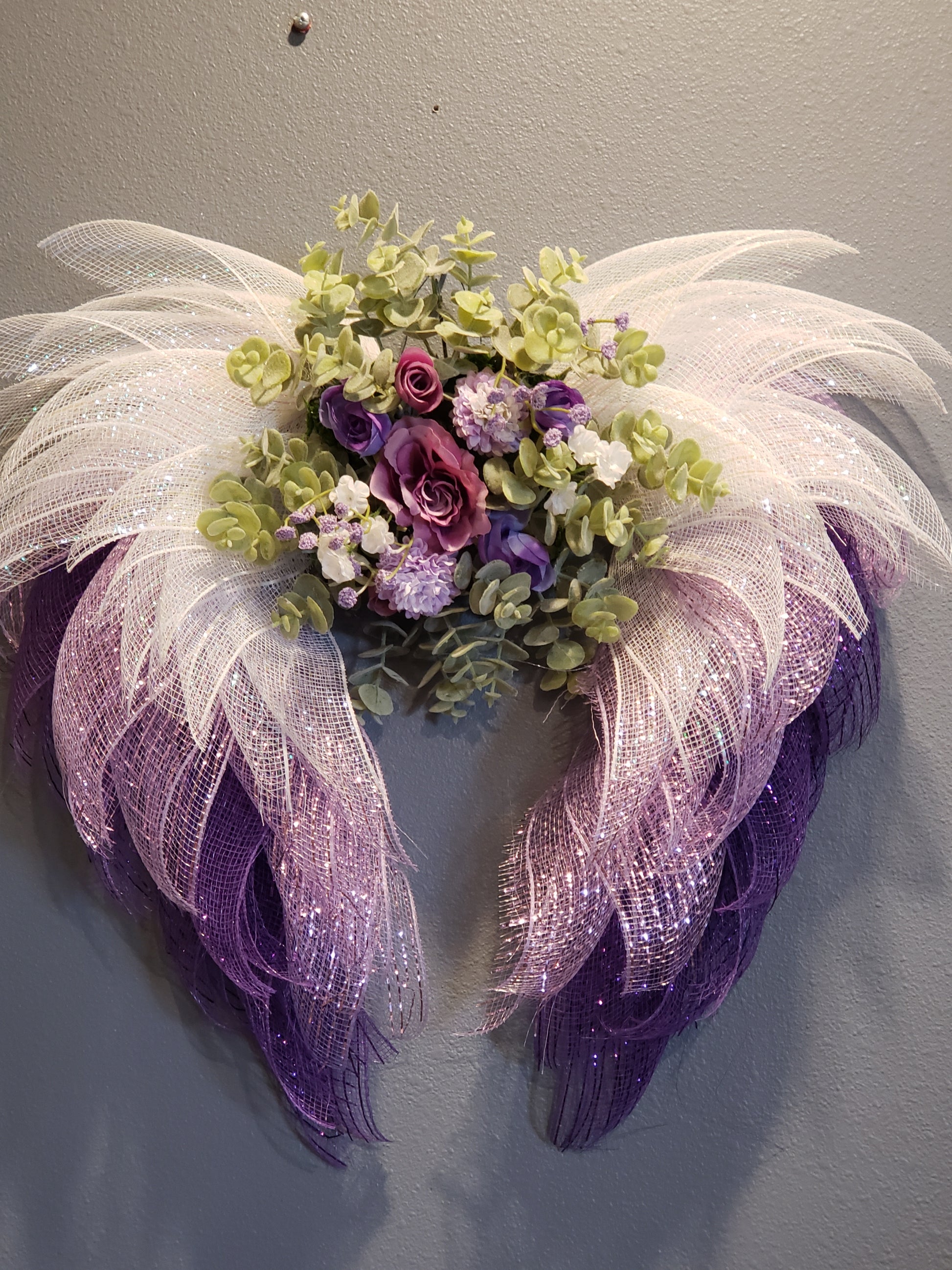 What a beautiful memorial to put on your love one's resting place. These angel wings are so beautiful and will bring peaceful thoughts. These can give you a feeling of still wrapping your arms around them with all your love. We can customize to your liking these are 20"x22"x5.5" in approximate measurments. These are all hand made when ordered timing to make is 3 to 7 days depending on demand.