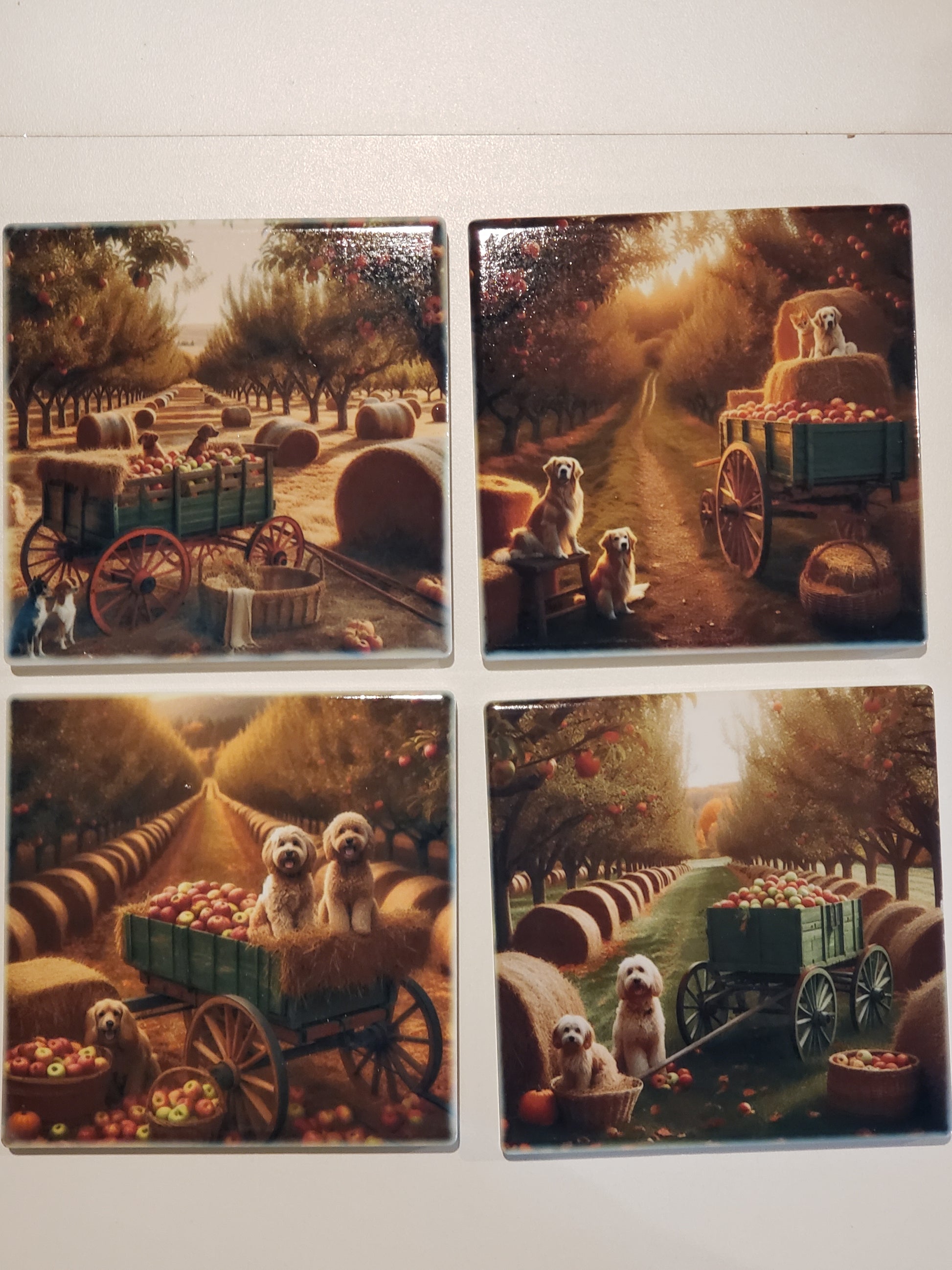 Ceramic Coasters Dogs in the apple orchard set of 4