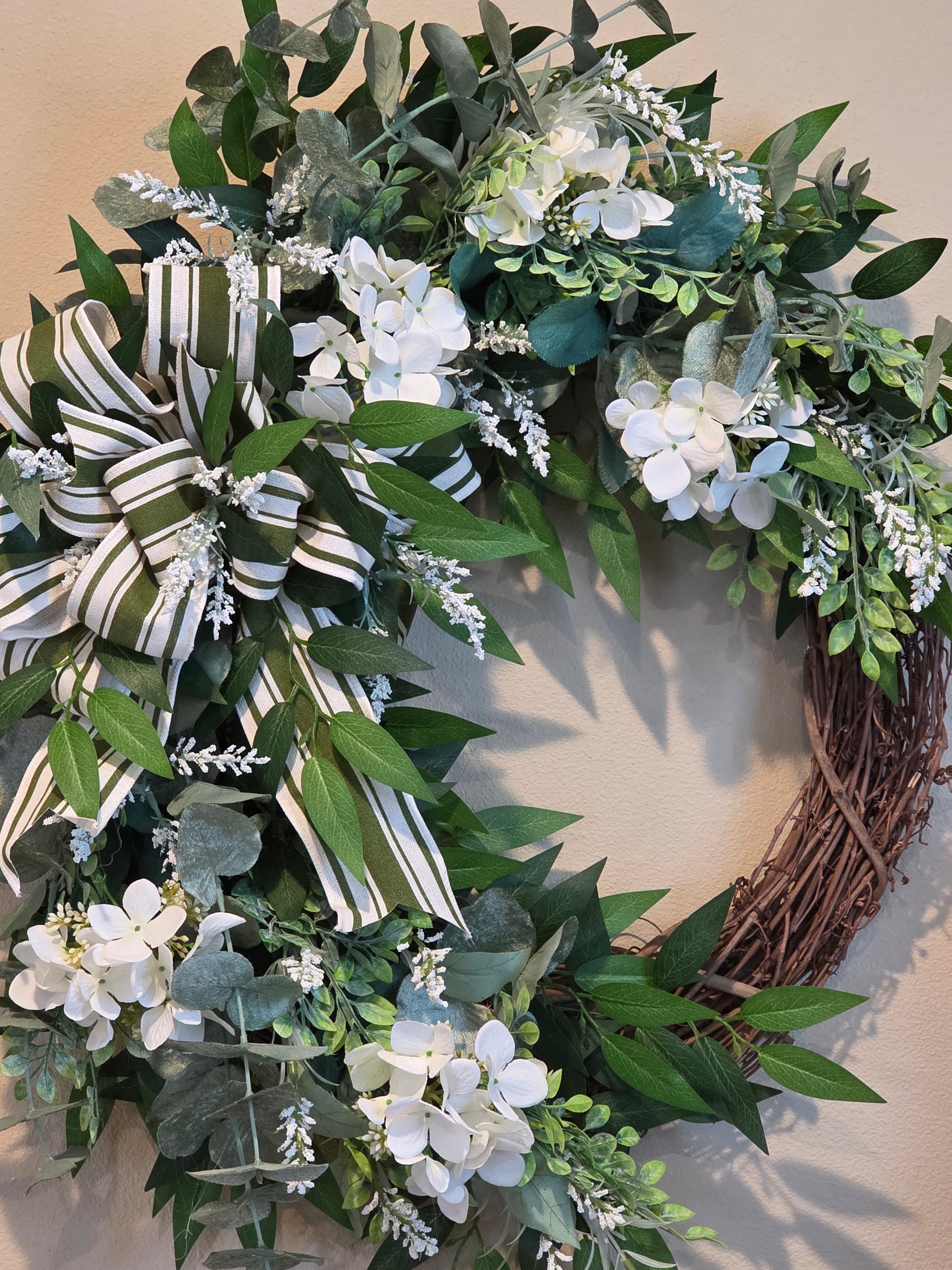 The every day wreath is perfect for that customer that only likes to have that one wreath that represents just about every day. It's luscious greenery and beautiful bow with white geraniums will turn many heads.