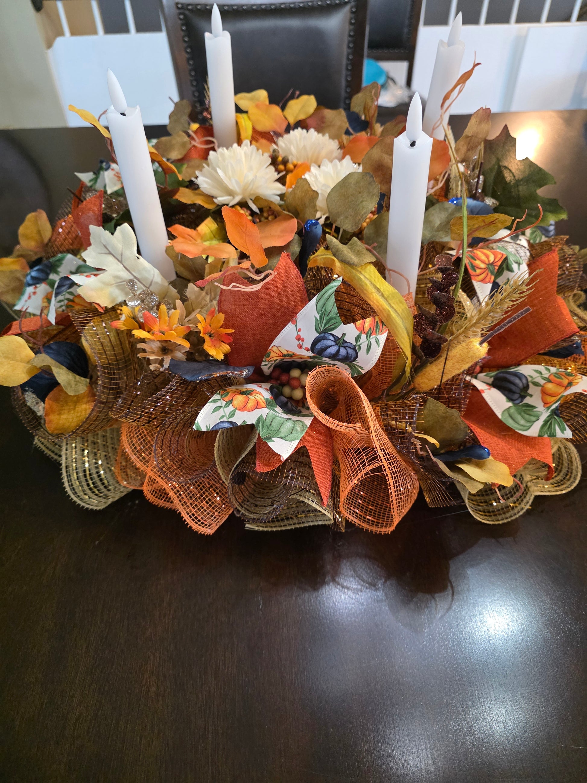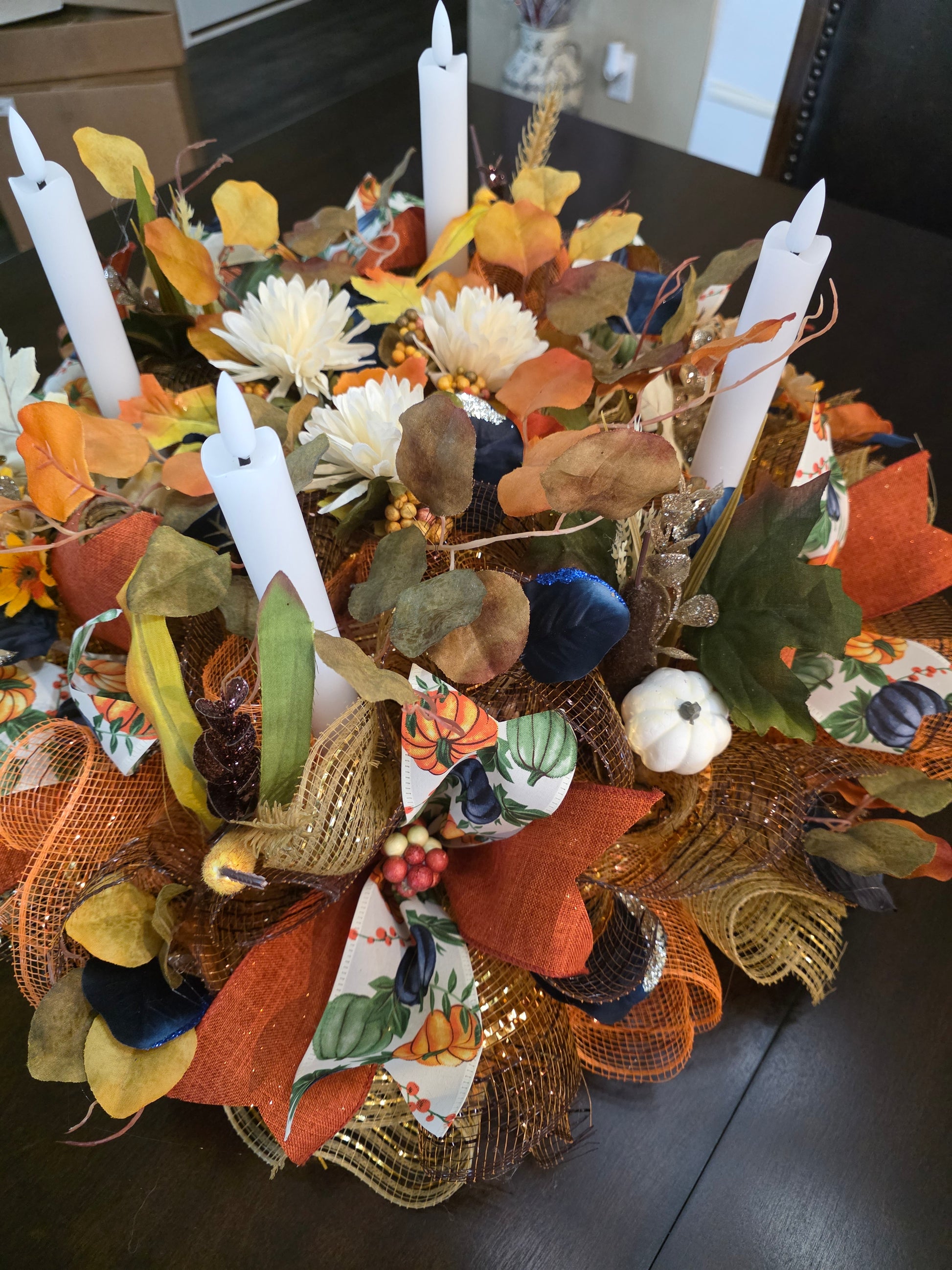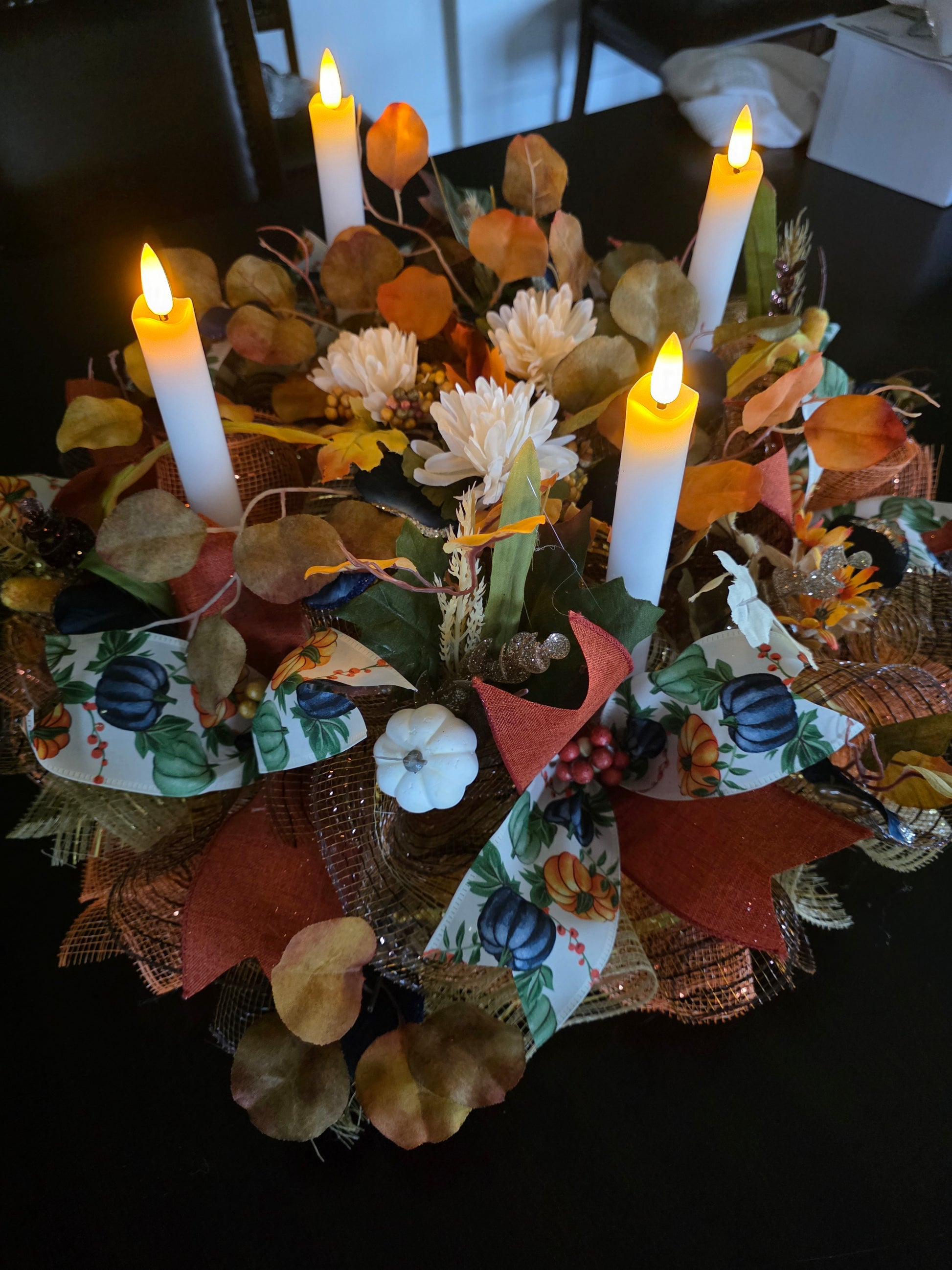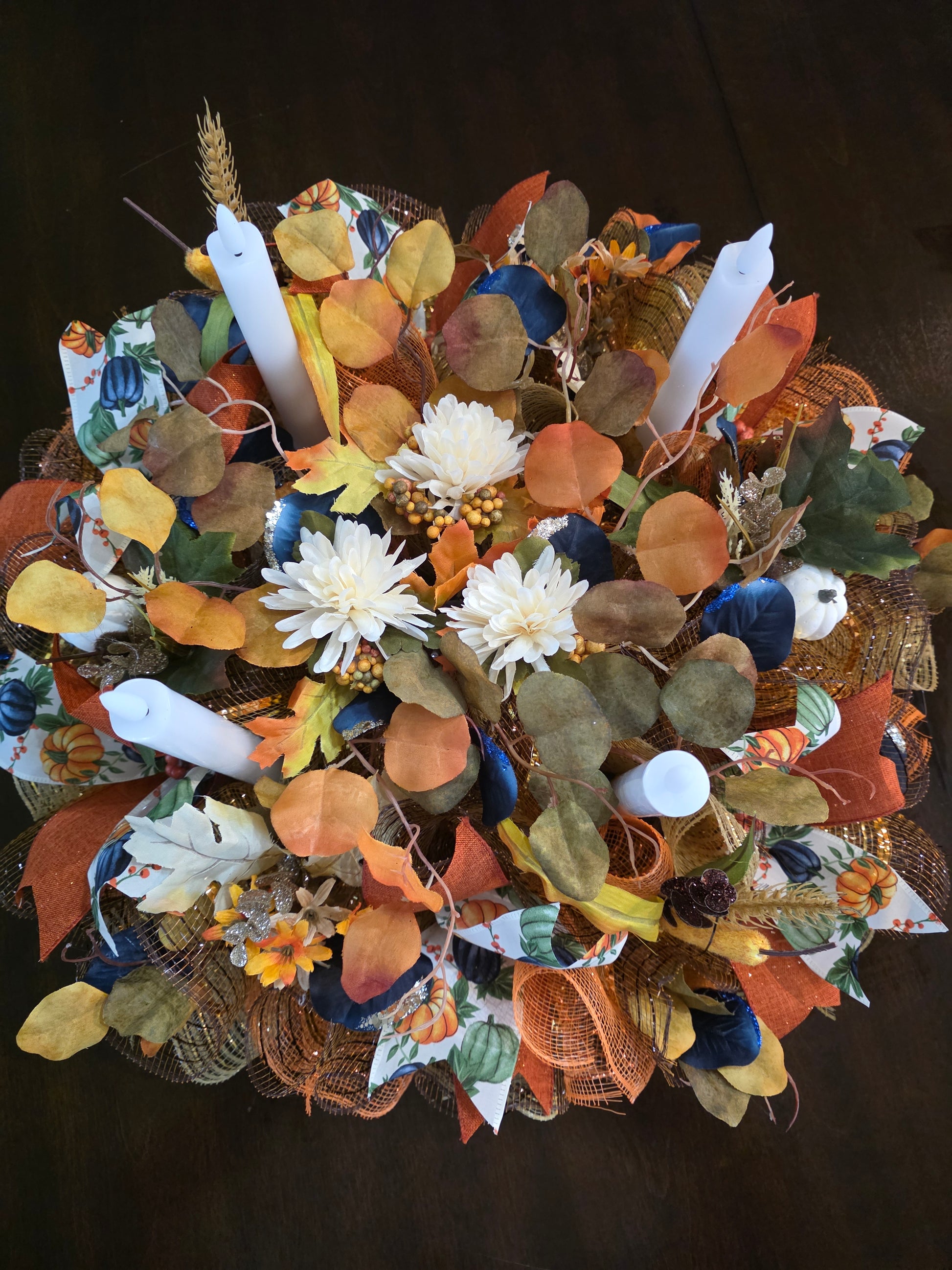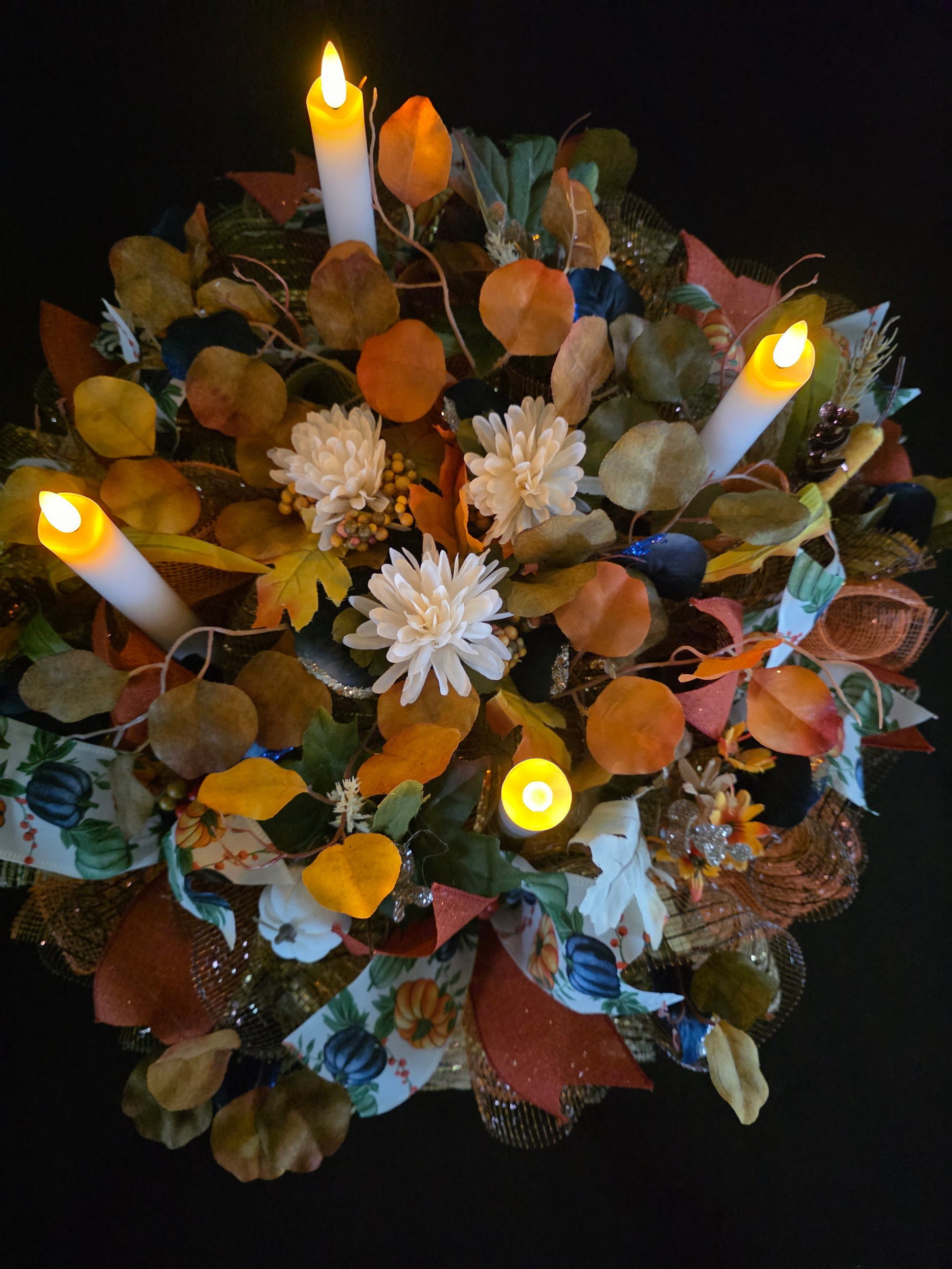 Beautiful mesh fall centerpiece with remote light up candles. This would be beautiful on a fireplace or table it will make your home that beautiful inviting feeling that everyone will want to come.