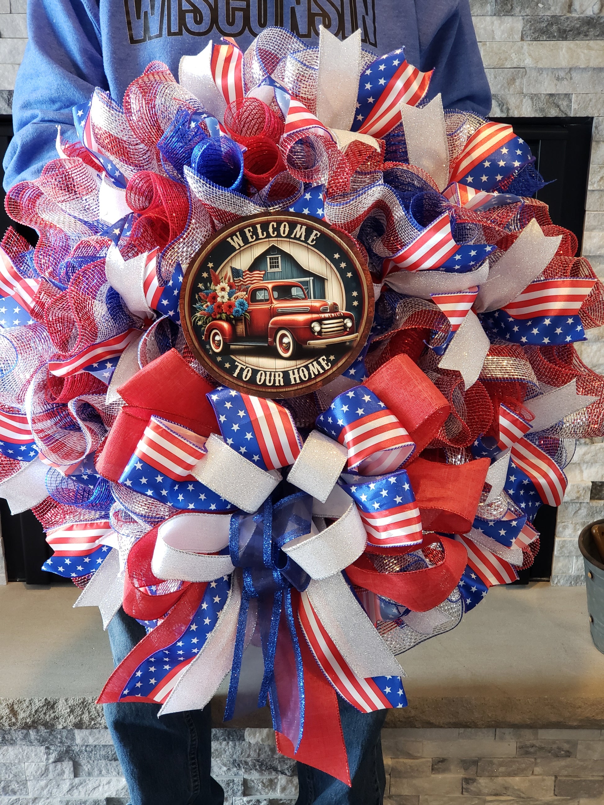 What a statement this wreath makes it is 28 inches in diameter. This is a deco mesh, ribbons a big beautiful bow plus a 7inch welcome to our home sign to make anyone feel the kindness and warmth that your home brings.. The patriotic look of this wreath makes anyone feel proud to be an American and celebrate our Independence! This can hang on a wall or be a door hanger or anywhere you chose. The wreath will have a sealer on it for protection of the elements of the weather if you have it outside. These wreaths are made when ordered so please be patient when ordering for they could take up to 2 weeks.