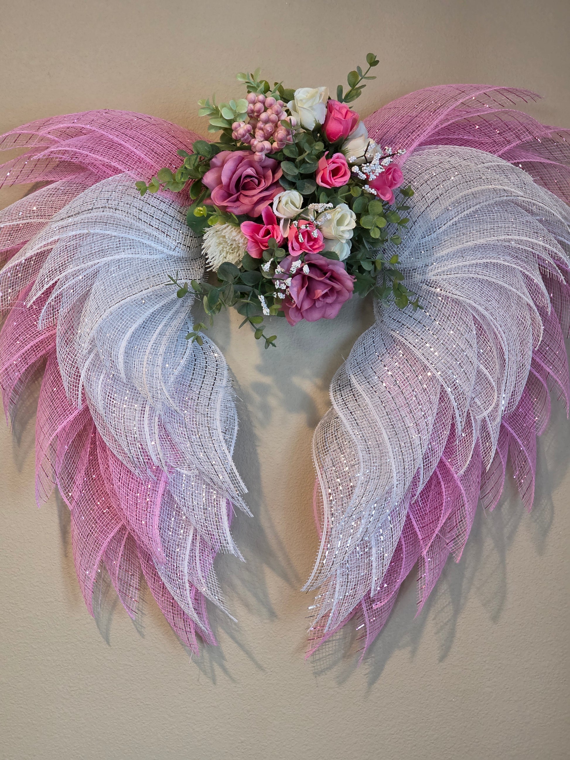 These angel wings are a new design I created and it turned out beautiful they will look beautiful as a memorial piece at anyone's resting place or hanging on wall or front door.The angel wings wreath are 21- 22"x 20"x5.5" in approximate measurments these are all hand made when ordered, timing to make angel wings is 3 to 7 working days depending on demand.