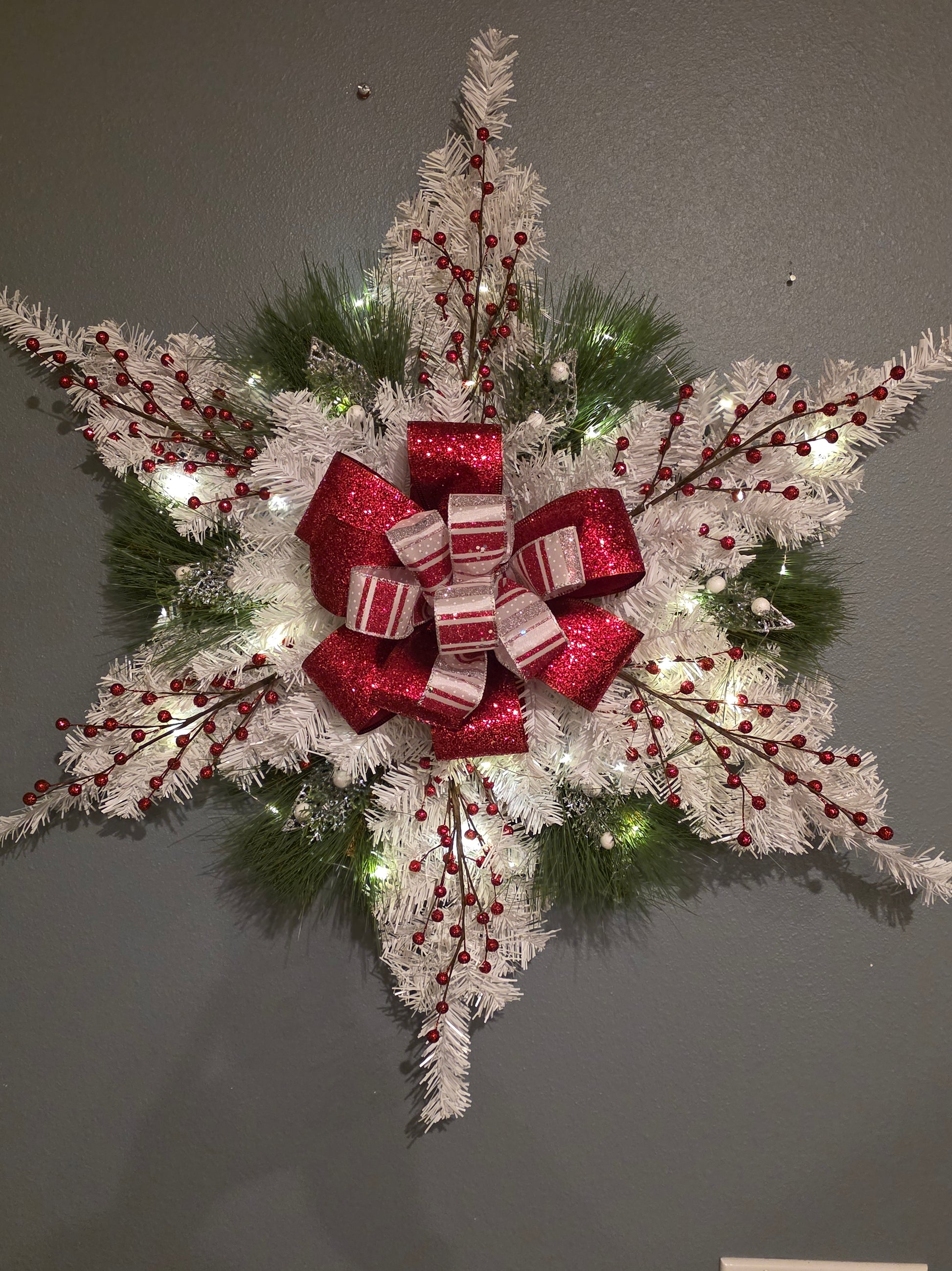 Show your place off with this large snowflake the beauty of it with the red bow and silver will put your decorating with a pure elegance. This snowflake has beautiful warm white lights with 8 different settings and timer of 6 hours on 18 hours off includes batteries. The size of this snowflake is 32 inches in circumference. These snowflakes are all handmade after the time of ordering please allow 5 to 7 days to be made.